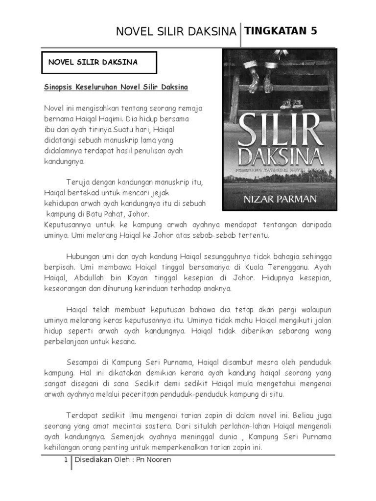 Berikut adalah sinopsis novel silir daksina yang menjadi novel rujukan komsas tingkatan 5 untuk tahun 2016 ~ 2021. Sinopsis keseluruhan novel silir daksina Novel ini juga memberi sedikit sebanyak info mengenai tarian seni zapin yang makin dilupakan kini. Di samping itu, pihak swasta sewajarnya menggunakan teknologi moden dalam mengurangkan pencemaran alam sekitar. Kekuatan novel ini juga terletak pada integrasi kaum antara masyarakat melayu dan cina. Hal ini dikatakan demikian kerana alat teknologi moden seperti boomvane dapat mengawal dan mengurangkan berlakunya pencemaran dengan lebih cepat dan efektif. Misalnya, penapis udara yang dipasang pada ekzos kenderaan dan sebagainya akan …
